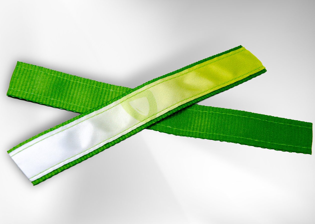Ragyogó felület: erre az alapra varrjuk rá a20 mm széles, puha tapintású, selyemfényű szatén szalagot. Ez a réteg adja a termék prémium jellegét és ez szolgál a grafika hordozójaként. Afull color digitális nyomtatási technológiának köszönhetően a lehetőségek szinte korlátlanok: